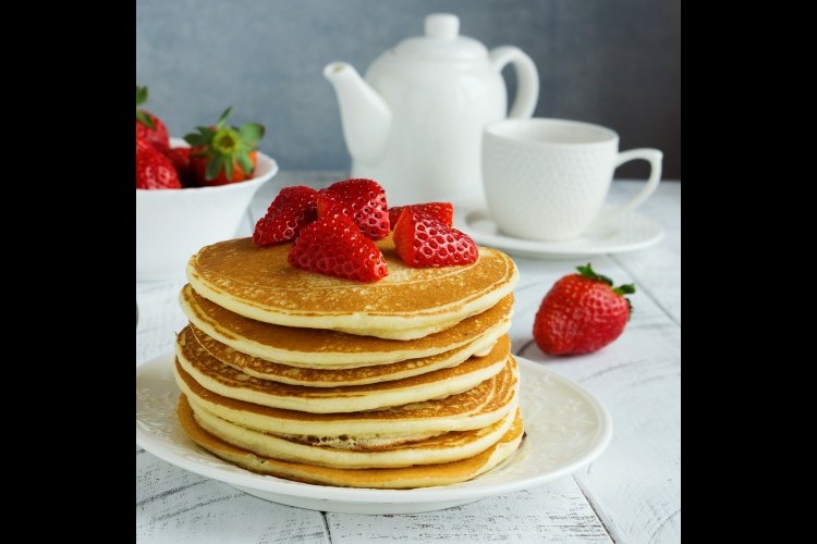 5. ثم يستخدم على "البان كيك" التي تزيّن بالموز والفراولة والكريما المخفوقة والصلصة.